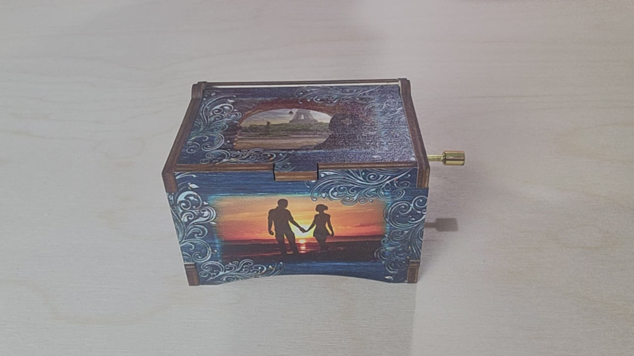 It’s a thoughtful keepsake inspired by the King of Rock 'n' Roll and the magic of being in love. Crafted with care, the lid features a tender image of a couple holding hands and gazing at a breathtaking sunset. On top of the music box, the Eiffel Tower stands tall in the background, like a scene straight out of a love story.